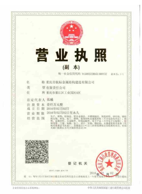 重慶市航標金屬結(jié)構(gòu)建造有限公司本著"管理創(chuàng)造價值,服務(wù)提升優(yōu)勢,品質(zhì)至上,服務(wù)至優(yōu)"的發(fā)展理念。團結(jié)、創(chuàng)新、務(wù)實、奮進是公司矢志不渝的追求。公司倍加珍惜每一分榮譽,堅持"質(zhì)量第一、用戶至上、以質(zhì)興業(yè)、以優(yōu)取勝"的經(jīng)營宗旨,不斷將優(yōu)秀建筑產(chǎn)品貢獻社會,與社會各界優(yōu)勢互補、同創(chuàng)輝煌!